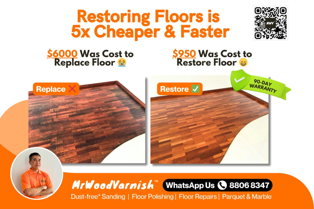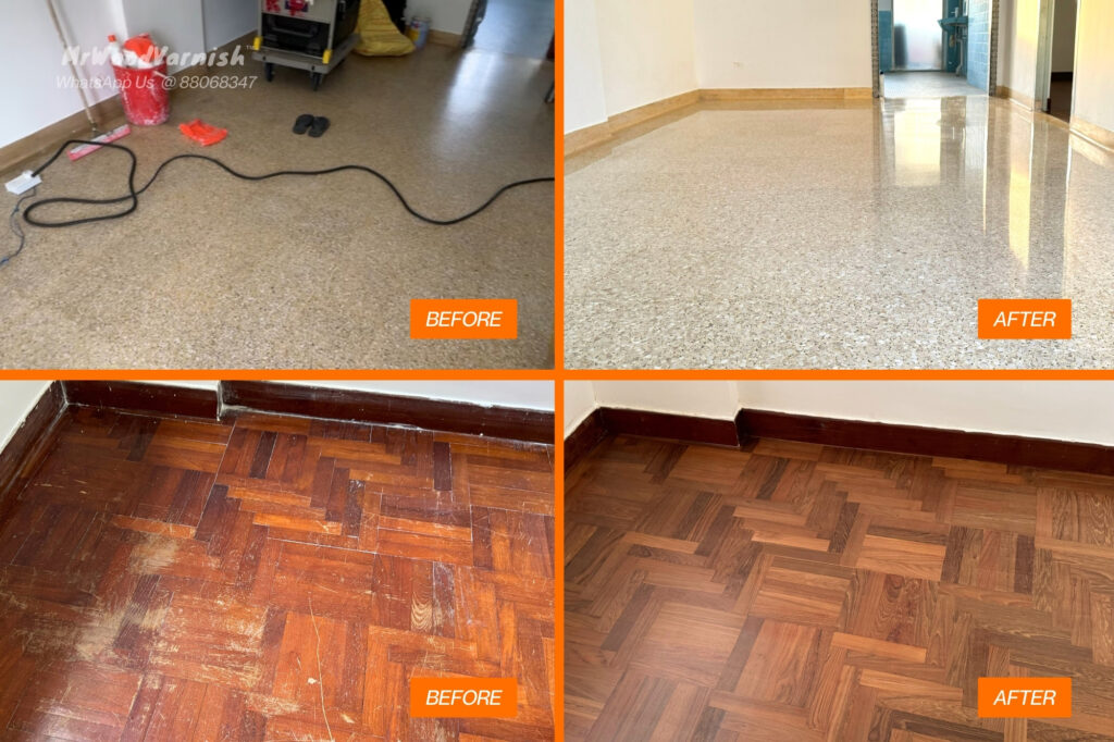 50-Year-Old Parquet & Terrazzo Marble @ Sin Ming HDB revived after our professional marble polishing, and parquet sanding and varnishing!